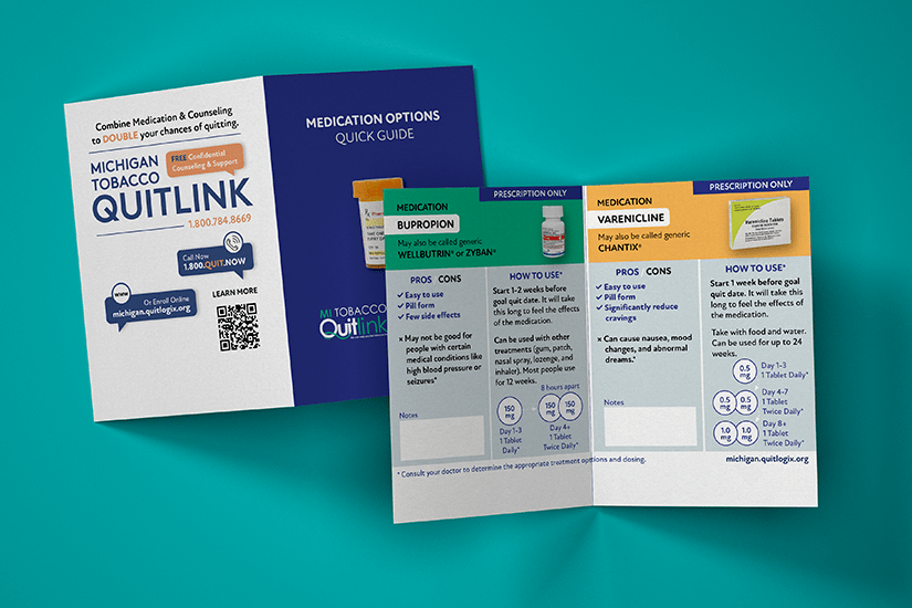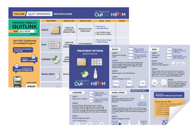 A visual guide of tobacco cessation resources including the Michigan Tobacco Quitline and NRT options.